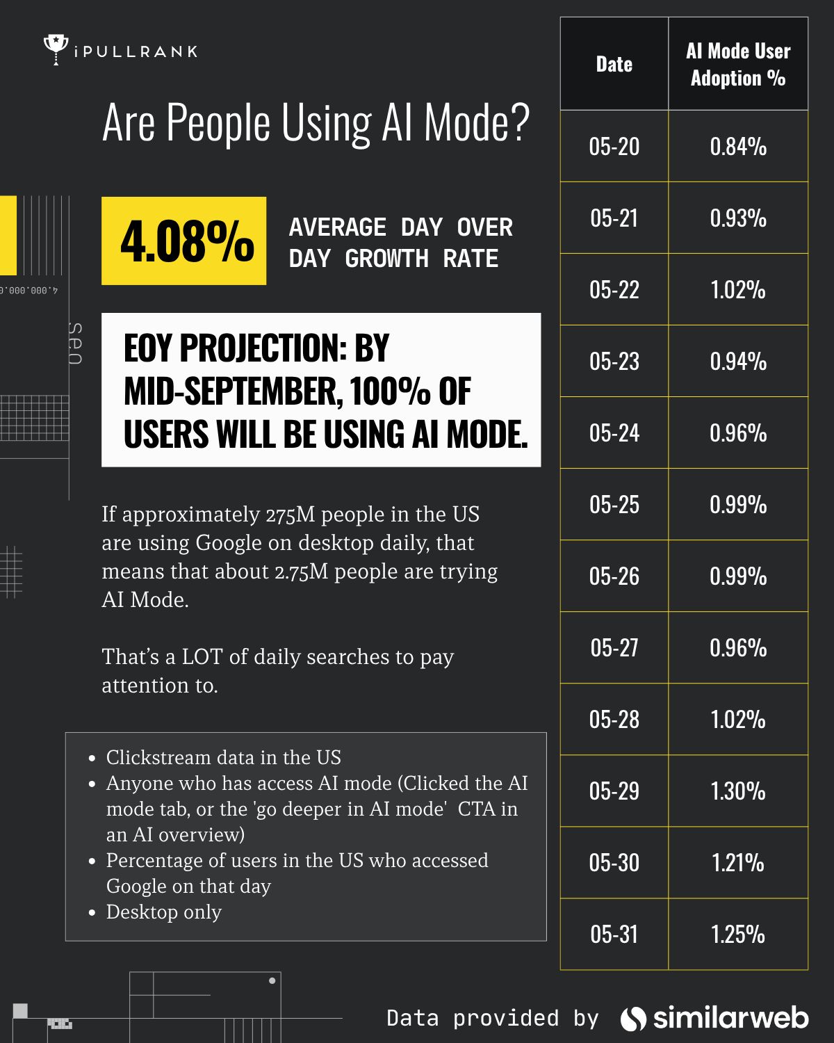 The game is changing—and fast as witnessed by the ever-changing stats of AI search usage (thanks to Mike King of iPullRank):